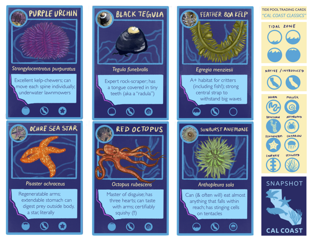 Snapshot Cal Coast mobilizes communities to collect iNaturalist observations of plants, animals, and seaweeds that call the California coast home. Download these free tide pool trading cards for an overview of species you're likely to see anywhere in California!