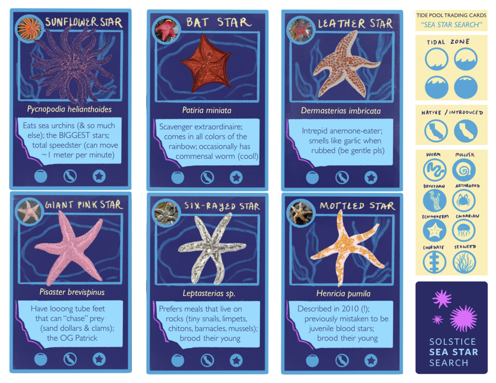 The Solstice Sea Star Search mobilizes communities to collect iNaturalist observations of sea star species that call the California coast home. Download these free tide pool trading cards for a glimpse at 6 iconic California sea stars!